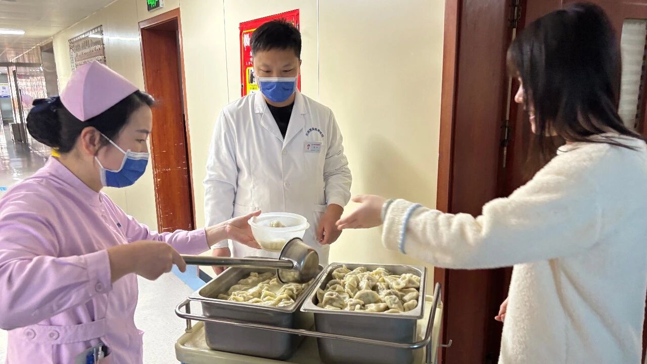 经过一个多小时的忙碌,一盘盘形态各异、饱含爱心的饺子陆续出锅。热气腾腾的饺子出锅后,医护人员将第一碗饺子送到了行动不便的患者床前,并送上诚挚的新年祝福。